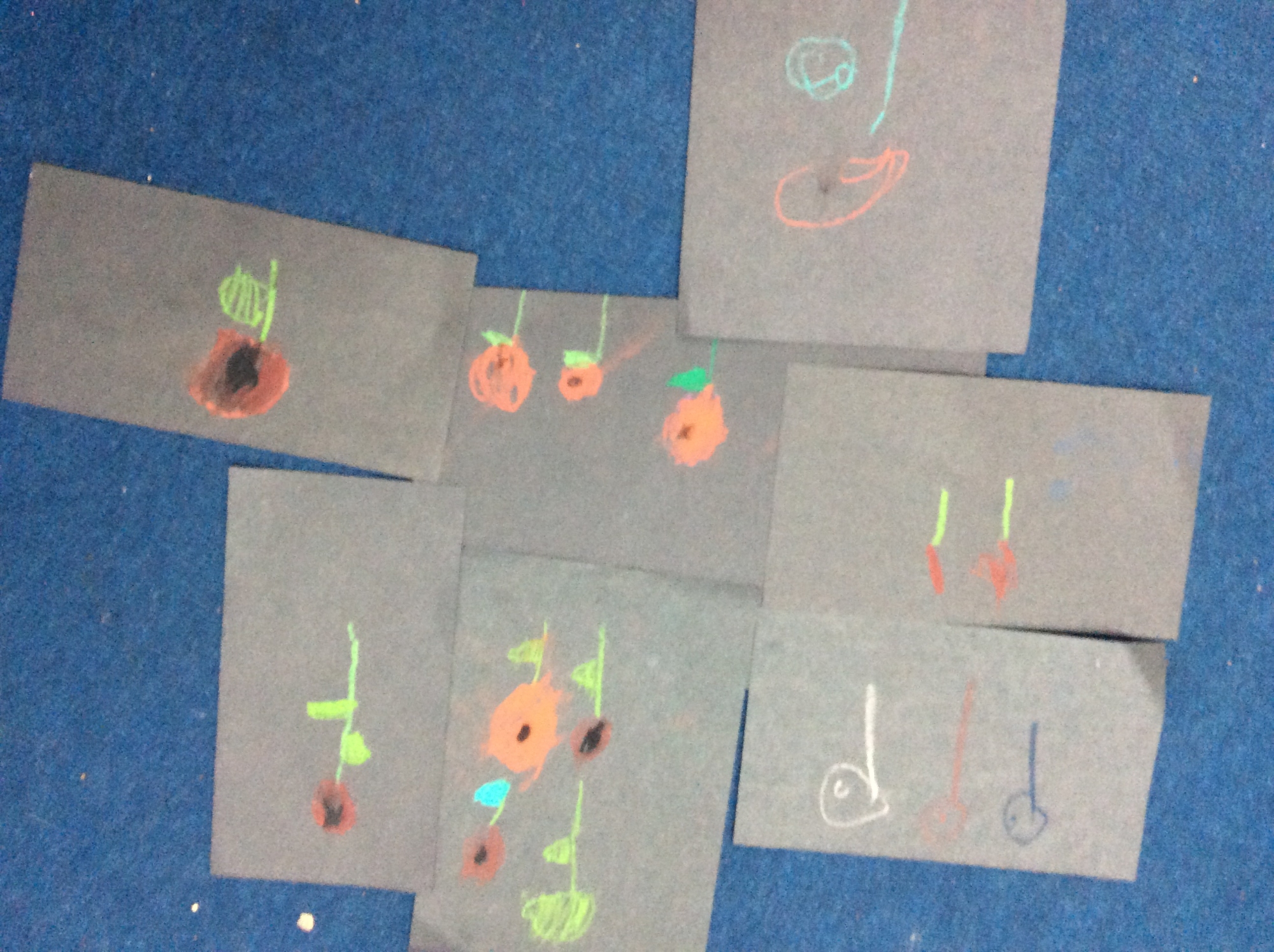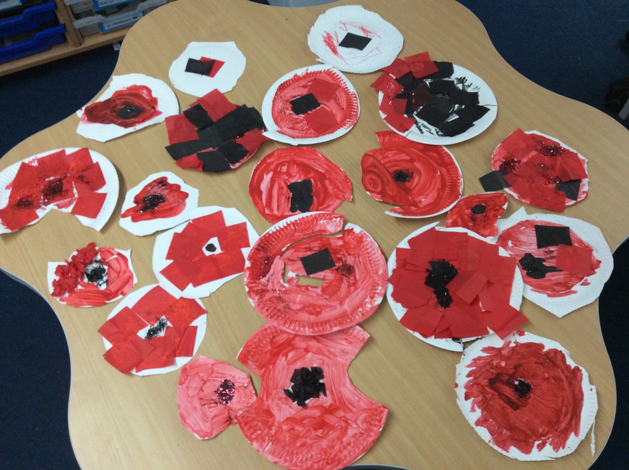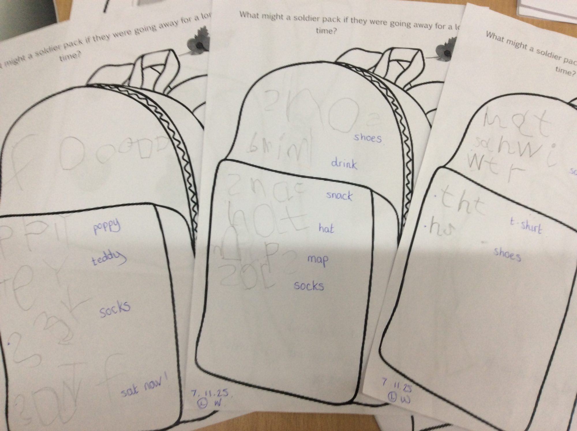 We wrote down a list of items that might be in a soldier's bag, learnt to crawl like a commando, drew and collaged poppies for remembrance and painted firework pictures.