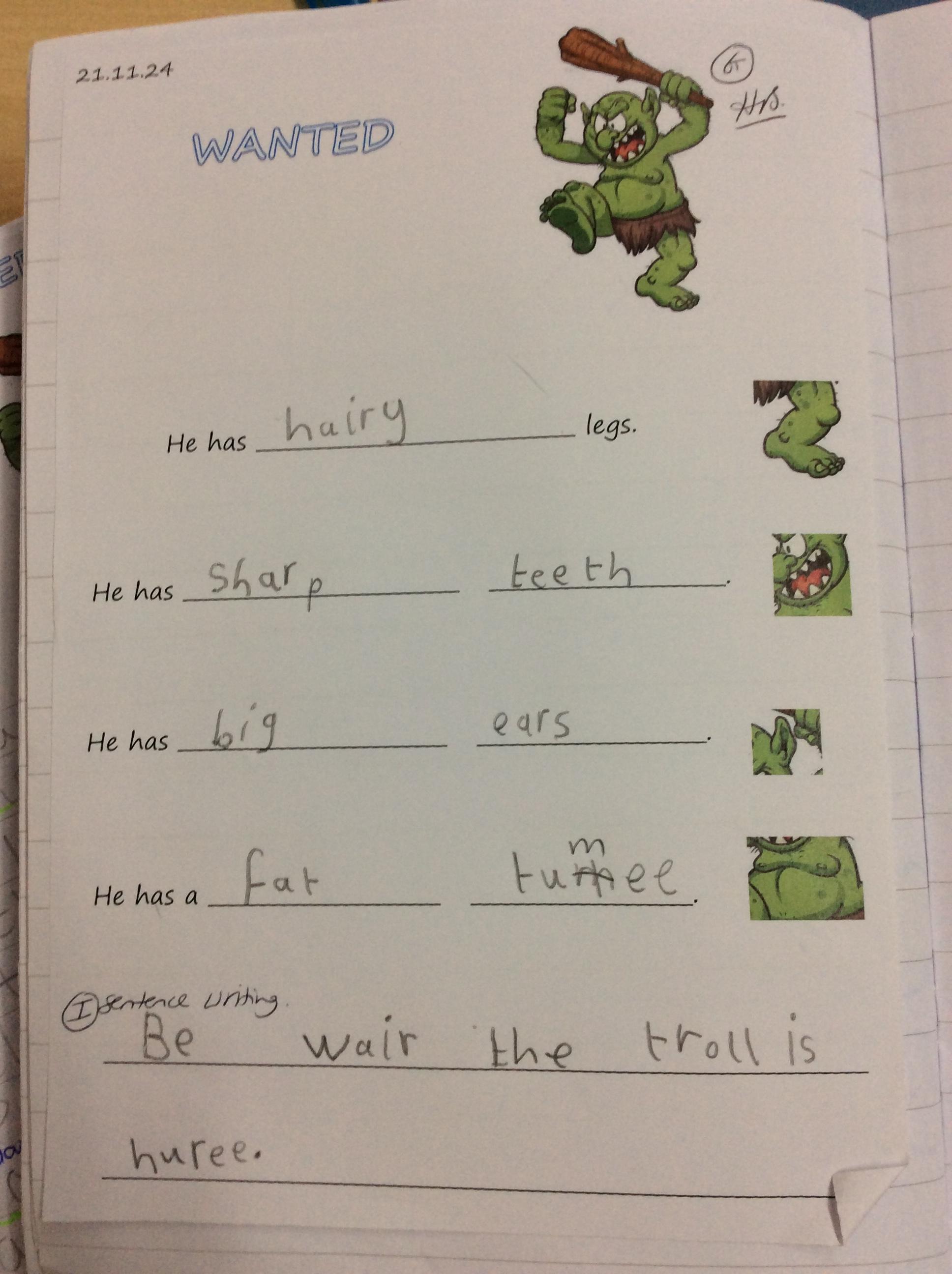 Children participate in high-quality English lessons that encompass a range of skills from the national curriculum. Daily phonics sessions are taught in EYFS and KS1 where we look at segmenting and chunking words to support spelling.  Children are exposed to a range of different high quality texts.  Teachers plan using recommended texts from HIAS and ensuring they are covering the curriculum.  Teachers take time to plan enchanting hooks that will capture the children's interest and excitement.  The writing outcome usually has a rel purpose that engages children and allows them to share their writing.  Children are given opportunities to write for a range of purposes, audiences and forms.
