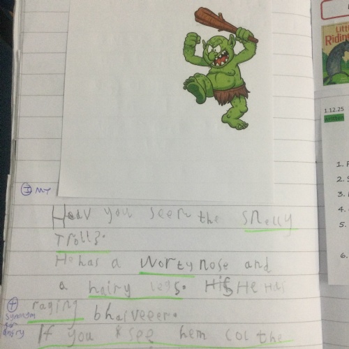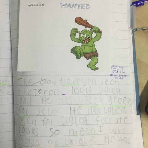 In English, the children were learning about The Three Billy Goats Gruff. After learning about what the troll looked like and some of the horrible things he had done, they made WANTED posters in an effort to find the troll. After designing their posters, they launched an appeal to find the troll by visiting Year 2 and reading out their posters.