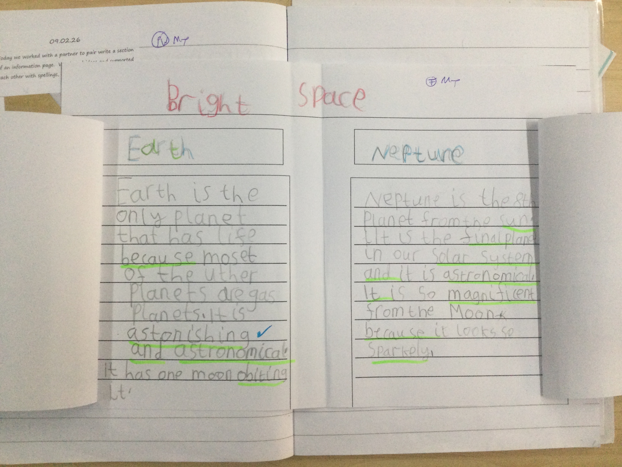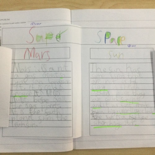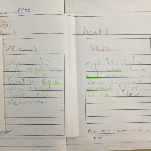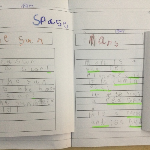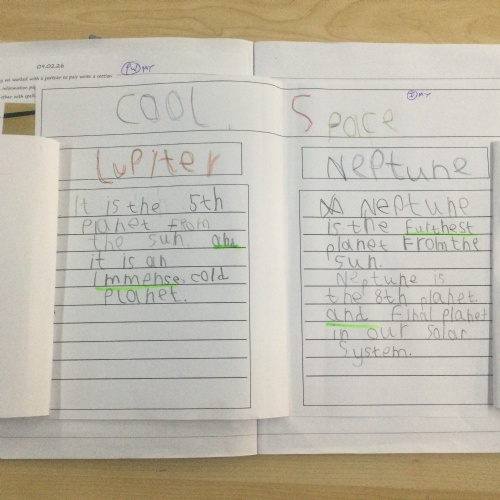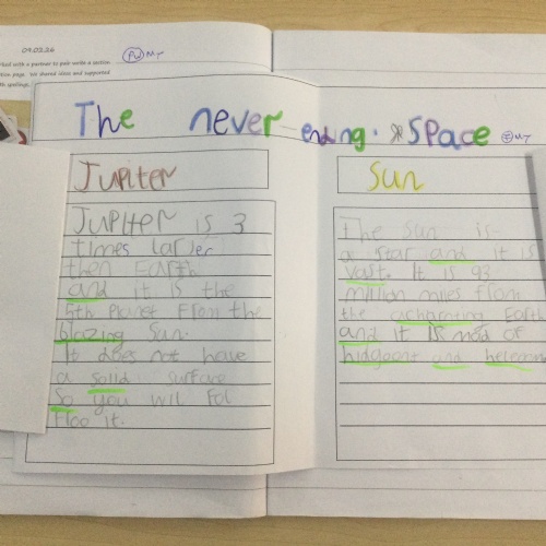 Over the past few weeks, our theme has been space and in English we have been learning about the planets in our Solar System as well as the Moon and the Sun. The children enjoyed collecting facts about each planet. After they had developed their knowledge on each of the planets, they selected two to write about in their information sheet. It was lovely to see children using various conjunctions and creative adjectives.