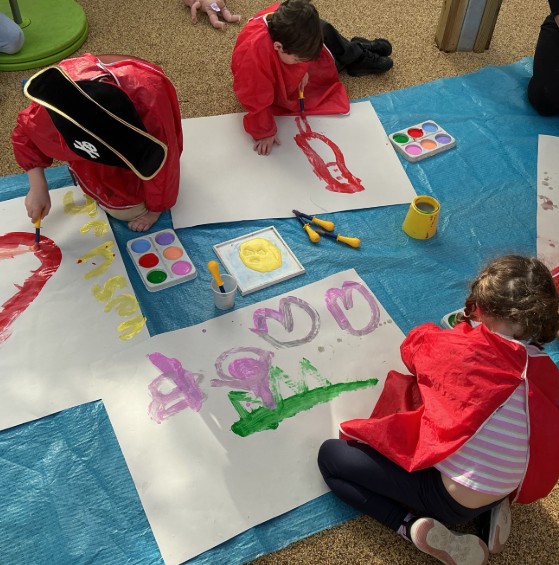 This week, we have been celebrating Reading Week. Our focus book was "Goldilocks and the Three Bears" and we have been exploring oats, talking about the words small, medium and large, and discussing whether we think it was right for Goldilocks to go into the bear's house. We were lucky enough to have an author visit the school, and we listened to her book "Gus and the Grumble", we then drew the animal characters. On Thursday it was lovely to see you all dressed up in your favourite characters and we shared our costumes with the group. We also took full advantage of the sun and took our art lesson outside this week. We were using paint to design the front cover of a book.