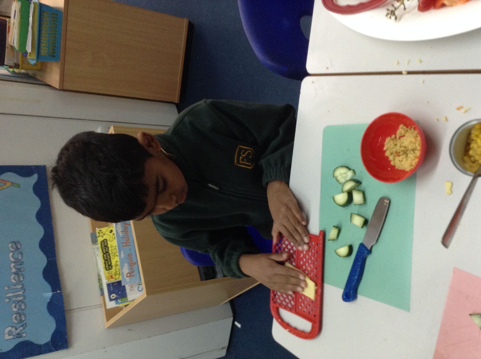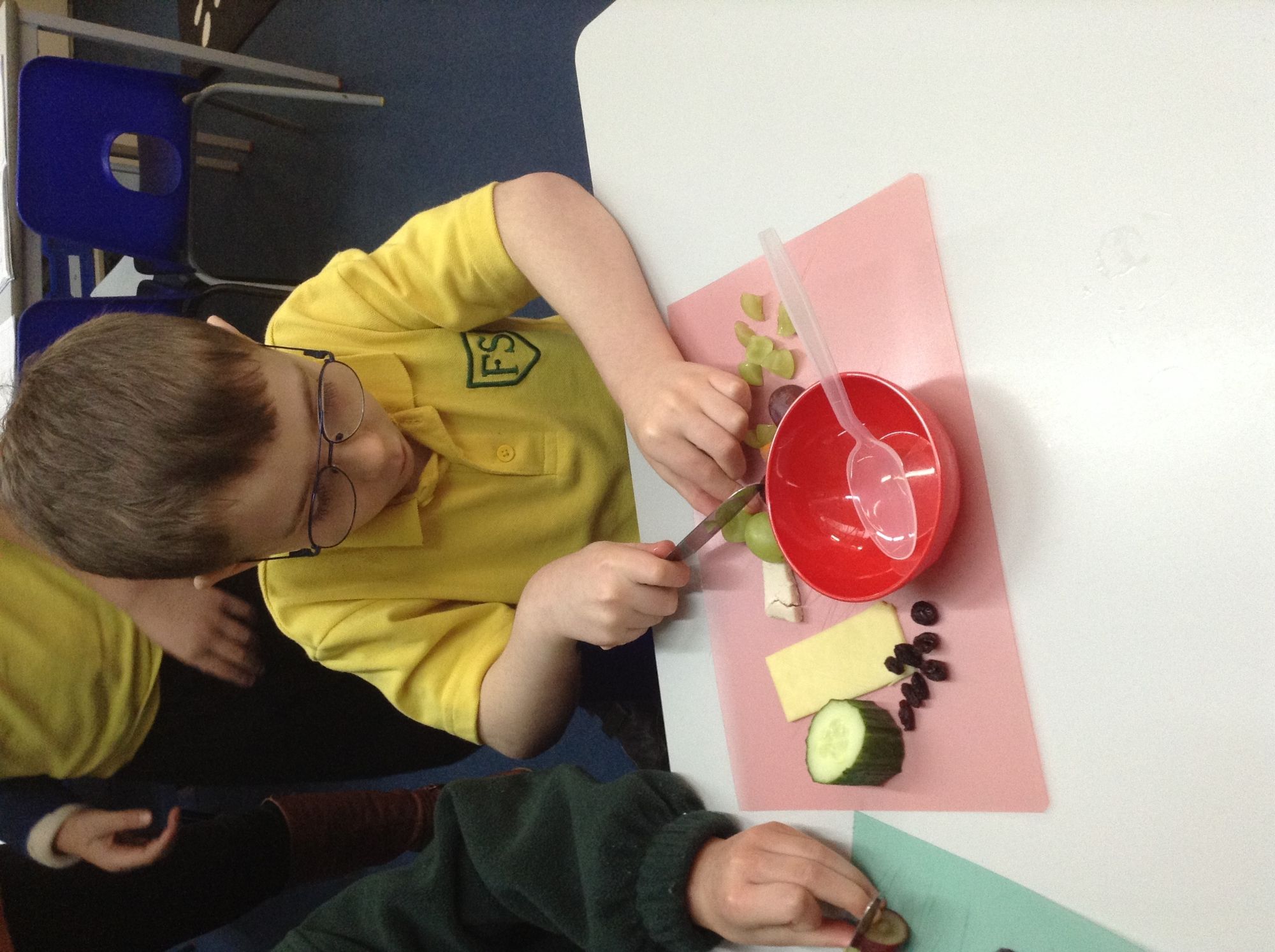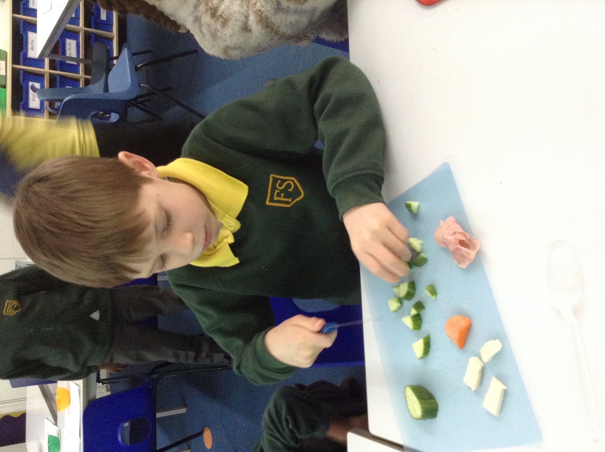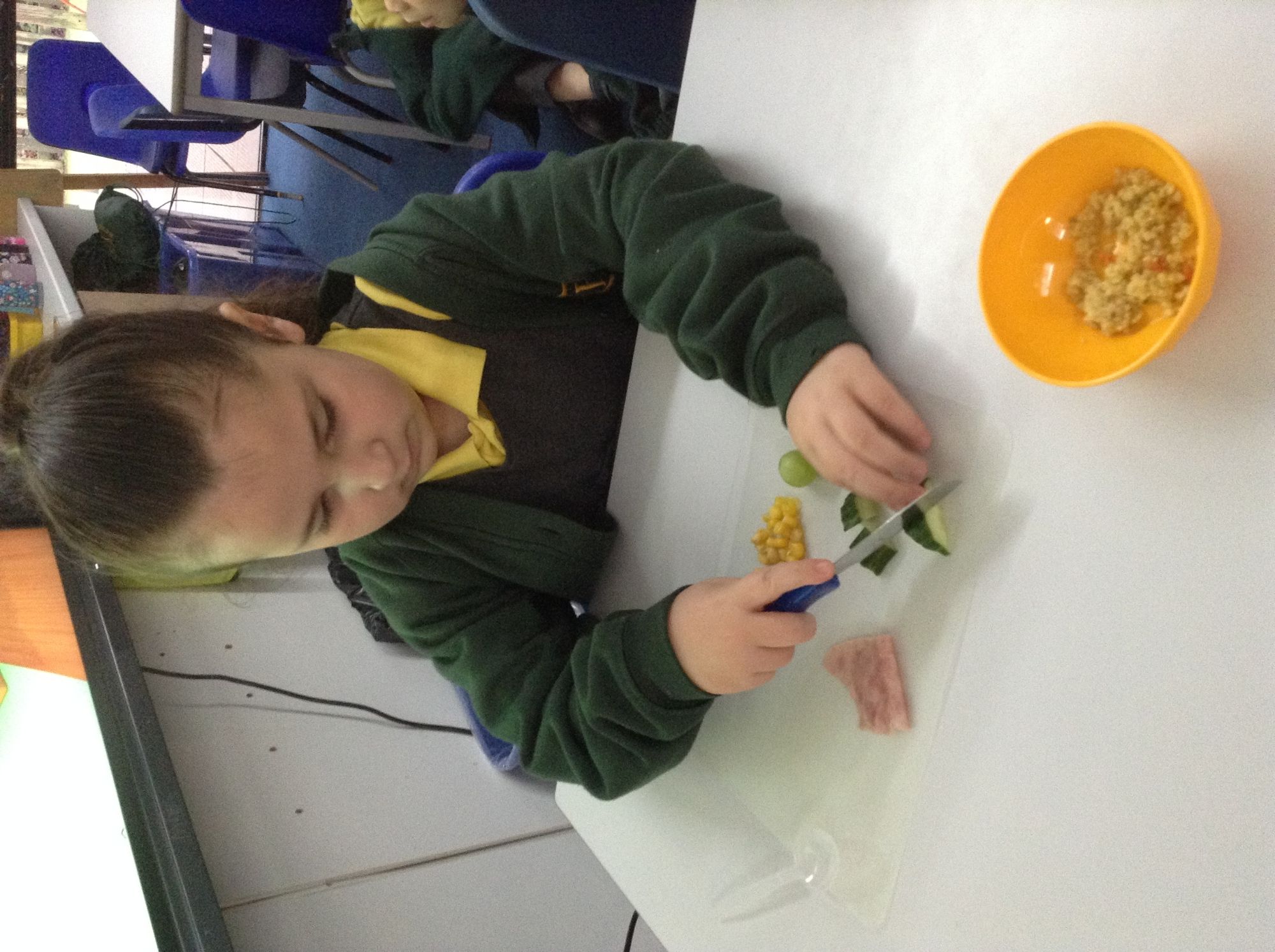 In DT, the children made couscous salad and used tools and equipment to perform practical tasks, chopping and mixing.