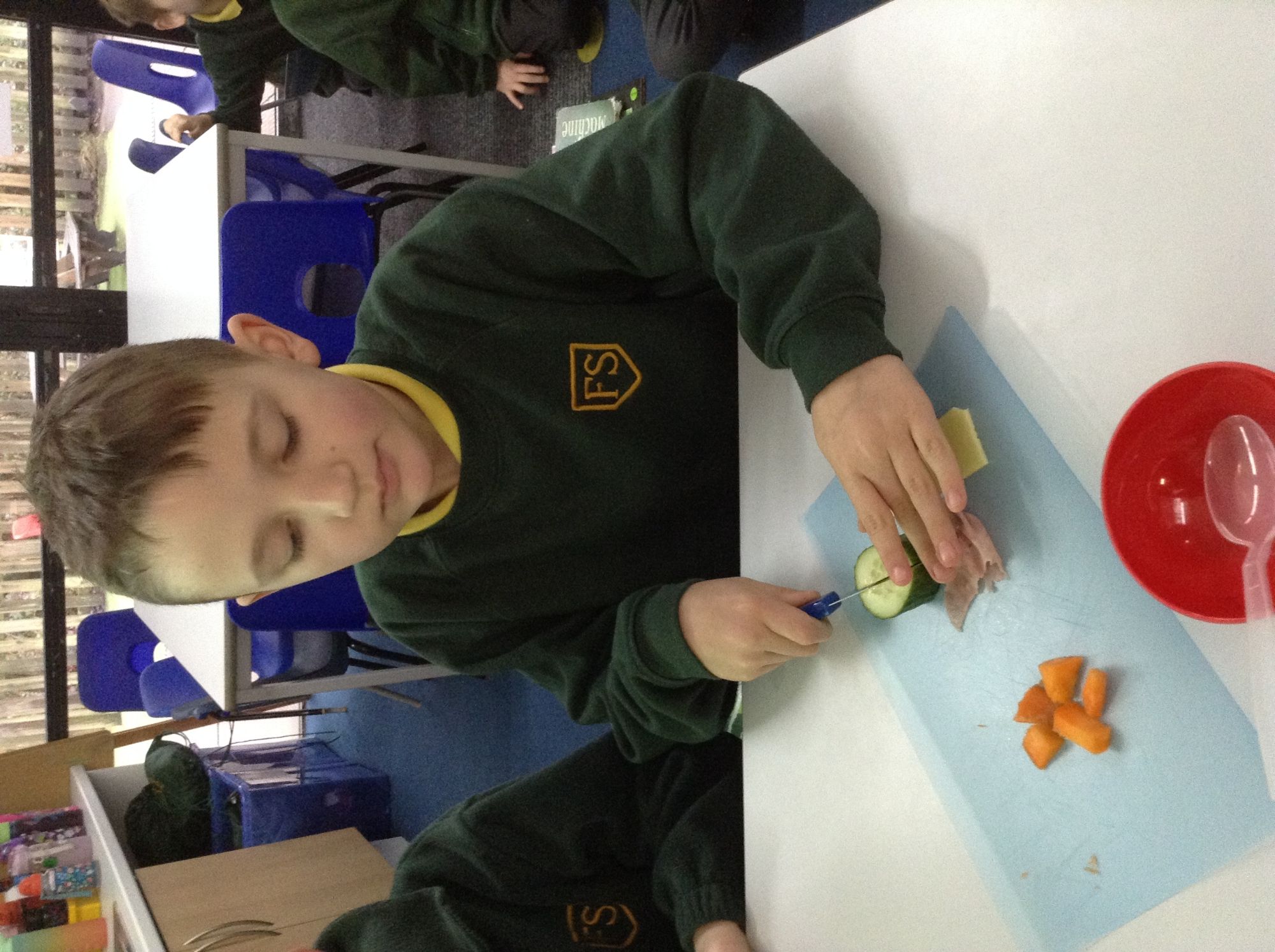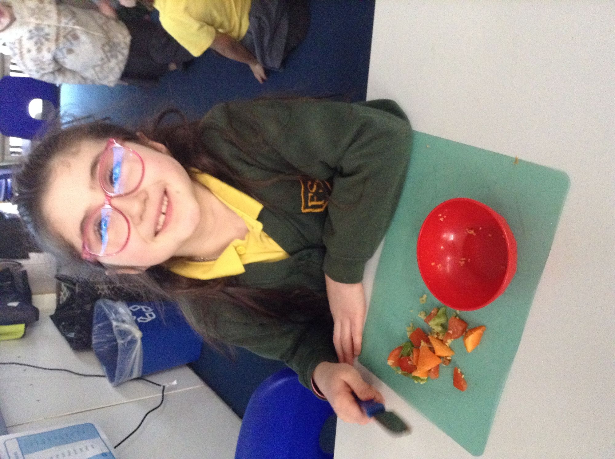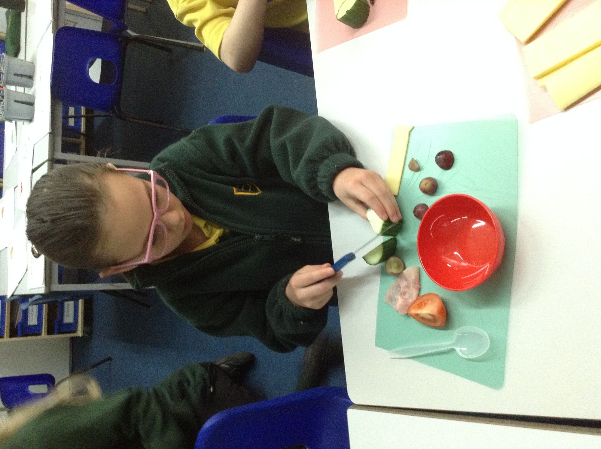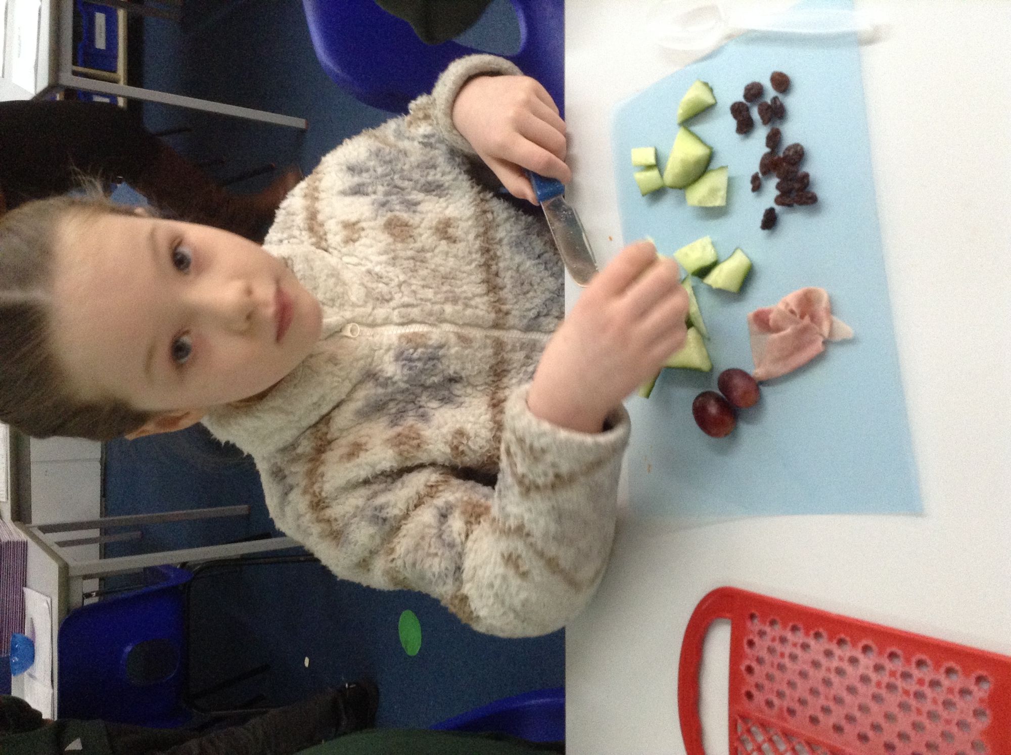 In DT, the children made couscous salad and used tools and equipment to perform practical tasks, chopping and mixing.