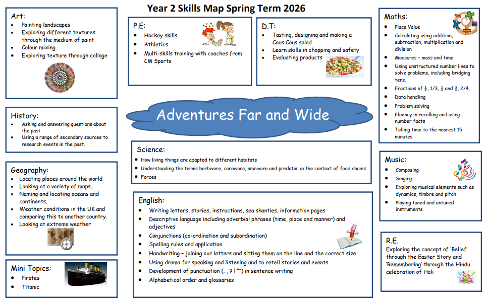 Our Topic this term is 'Adventures Far and Wide'. Below are some of the things the children will be learning this term.