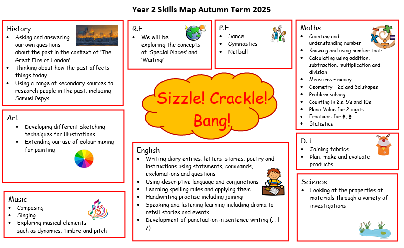 Our Topic this term is 'Sizzle, Crackle, Bang'. Below are some of the things the children will be learning this term.